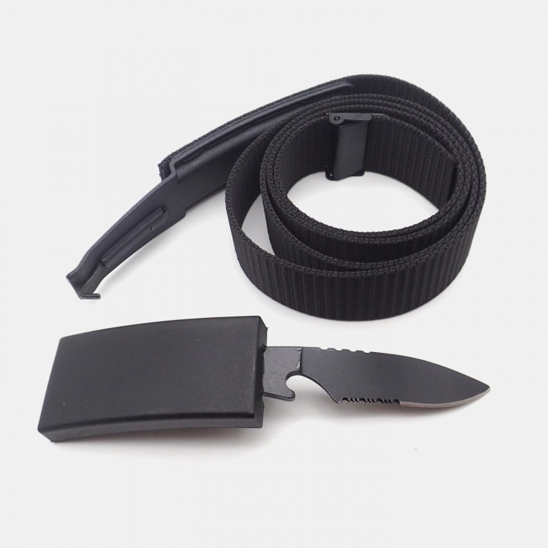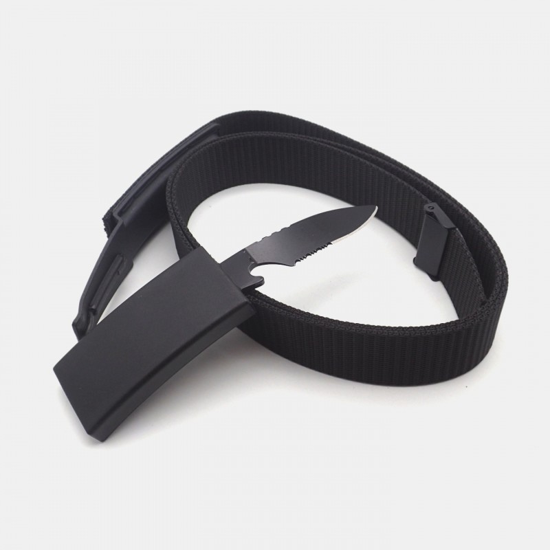 Belt-buckle knife can be used in hiking, hunting and fishing, thanks to the special shape of the blade, it can be used for cutting solid objects. Belt with Knife is made of durable tear-resistant nylon, buckle-sheath is made of plastic under the tree without backlash, the knife blade is made of high quality stainless steel.